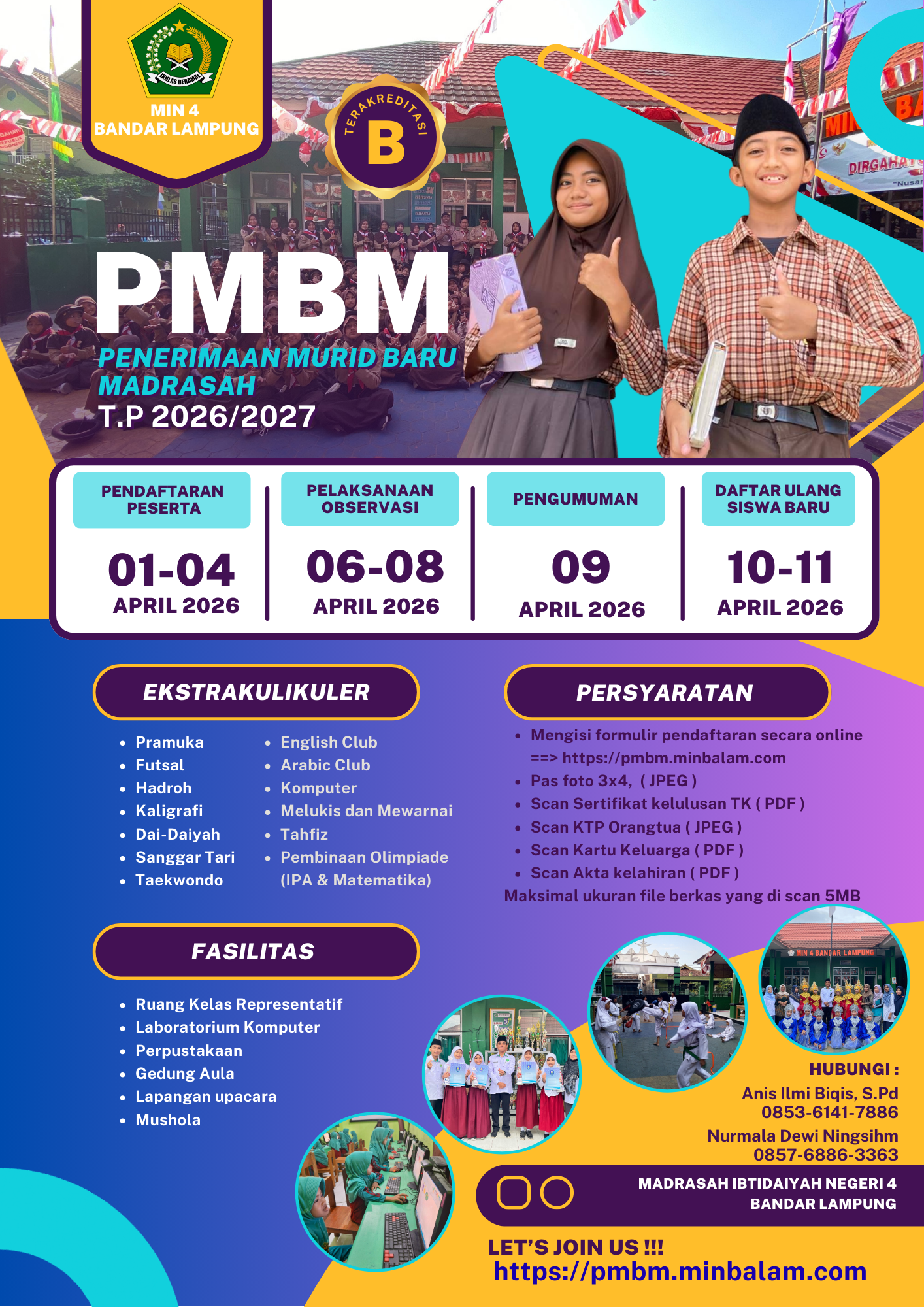 Informasi PPDB Selasa, 10 Maret 2026 83x dibaca Penerimaan Murid Baru Madrasah 2026 ==> Persyaratan Pendaftaran Murid Baru 2026==> Mengisi formulir pendaftaran secaraonline ==> https://pmbm.minbalam.com==> Dokumen yang di UploadPas foto 3x4, ( JPEG )Scan Sertifikat kelulusan TK ( PDF )Scan KTP Orangtua ( JPEG )Scan Kartu Keluarga ( PDF )Scan Akta kelahiran ( PDF )Scan Sertifikat prestasi ( PDF ) Scan Kartu KIP, PKH ( PDF )Maksimal ukuran file berkas yang di scan 5MB