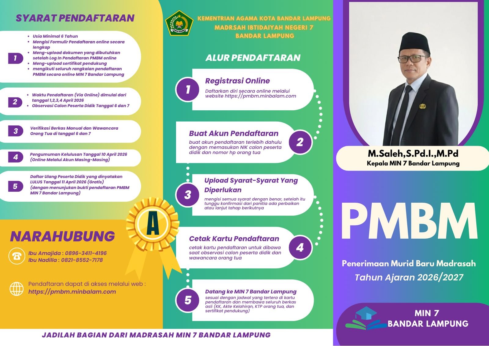 Kepala MIN 7 Bandar Lampung, M. Saleh, S.Pd.I., M.Pd., menyampaikan bahwa pendaftaran dilakukan secara online guna memudahkan calon peserta didik dan orang tua. Proses pendaftaran dapat diakses melalui laman resmi yang telah disediakan oleh pihak madrasah.